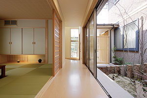 母屋の右側に片流れ屋根の建物を増築。格子戸と坪庭の後方で母屋とつなぎました